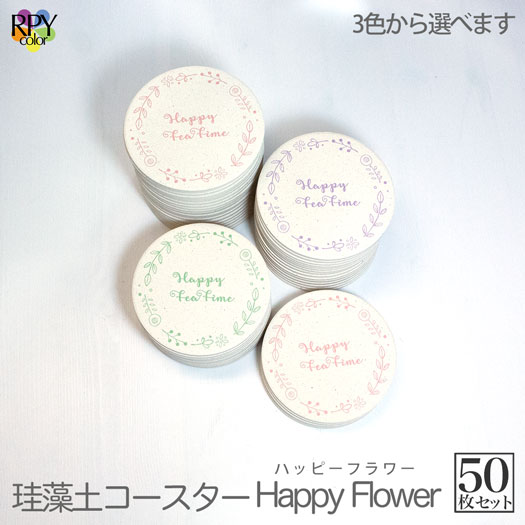 業務用 食器 カフェ 珪藻土 コースター まとめ買い 即納 厨房用品 食器 飲食店 かわいい モダン日本製 珪藻土 けいそうど くっつかない 吸水 結露 洗える 人気 珪藻土 コースター 50枚 セット RPY ハッピーフラワー グリーン 緑 紫