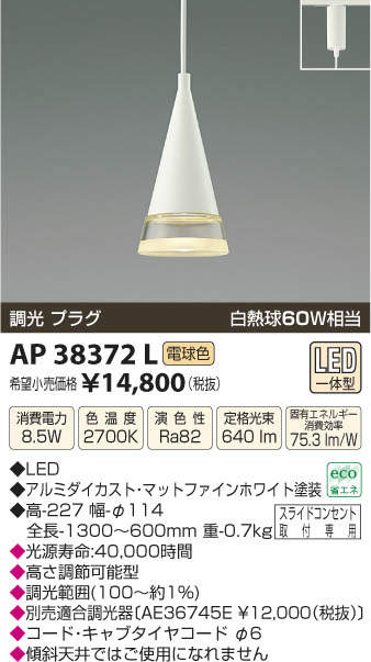 【LEDペンダント】【電球色 調光タイプ(調光器別売)】【プラグタイプ】AP38372L