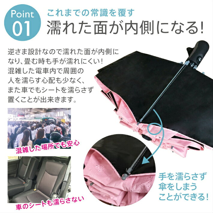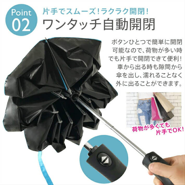 商品説明【カラー】 ・ミント・ネイビー・ベビーピンク・ラベンダー・ローズピンク・ウォーターブルー【サイズ】 直径108cm、(折りたたみ時)約33.5cm、約410g【詳細】・ボタンを押すだけ! 片手で自動開閉! ・片手がふさがっていても使いやすい・直径108センチ、二人で入っても濡れない大きめサイズ ・カバンに入れておけるのでゲリラ豪雨や急な夕立でも安心 ・急な雨でも安心の自動開閉折りたたみ傘!8本組アルミ合金炭繊維傘骨を使用、耐久性抜群! ・自動開閉を手動で行った場合、破損の原因にもなりますのでご注意ください。