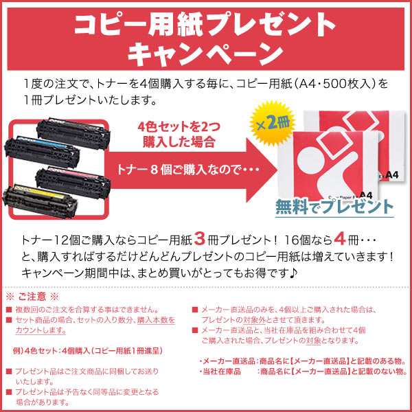 【プレゼント企画についてのご注意】 ■1度の注文で、トナーを4個買う毎に1冊、コピー用紙をプレゼントします。