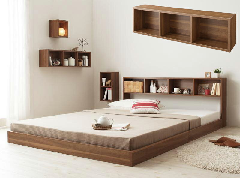 ウォールシェルフ付ディスプレイフロアベッド 【falley】 フォーレイ 【国産カバーポケットコイルマットレス付き】 ダブル+ウォールシェルフ1BOX ローベッド 国産付 ダブルベッド ベット ベッドマット付き 低い 収納付き 壁掛け 飾り棚 壁付け(代引不可)(NP後払不可)